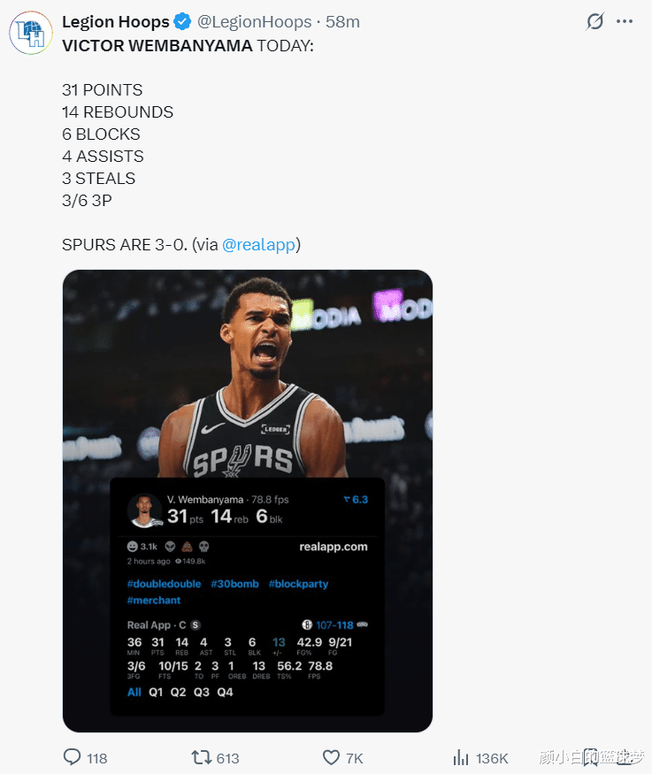此役文班亚马36分钟,21中9,三分6中3,罚球15中10,拿到31分14篮板4助攻3抢断6盖帽2失误,命中率42.9%,三分命中率50%,真实命中率56.2%,文班亚马依旧是攻防一体的表现。