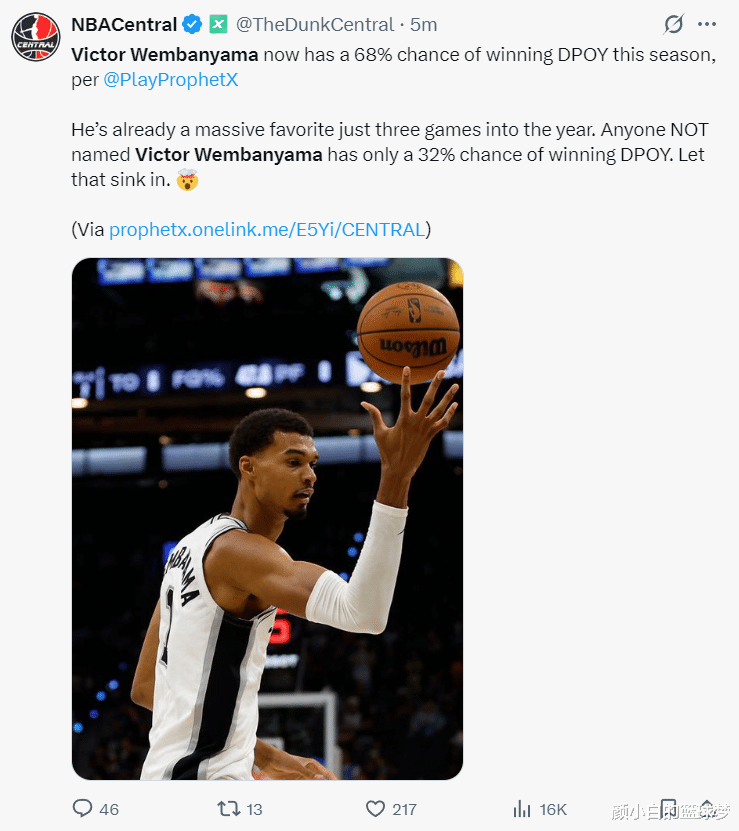 根据数据媒体PlayProphetX的数据预测,文班亚马本赛季获得DPOY(最佳防守球员)的概率已经达到68%,他仅仅出战三场比赛就成为DPOY的第一热门人选,其他人合计只有32%的概率。